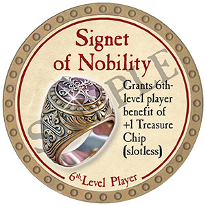 This ring has no in-game effect. Those who have earned a Signet of Nobility gain +1 Treasure Chip at the end of their adventure. This token cannot be equipped. The token itself does not bestow any benefit. The purpose of this token is to show physical proof that the player has achieved 6th level. Even though some character manager software may allow you to “equip” this token, within the context of the in-game world, this token does not exist. As far as your character is concerned, the benefit is the result of years of experience. This ring is not a treasure-enhancing token. It is tangible proof that a player has earned the privilege of gaining an extra treasure pull. This item does not affect tokens that restrict the number of treasure-enhancers a character can equip. E.g., a character run by a 6th-level player with a Signet of Nobility may equip Gloves of the Raider. Note: Unlike most other tokens, a Signet of Nobility token may not be sold, traded, nor lent to other players.